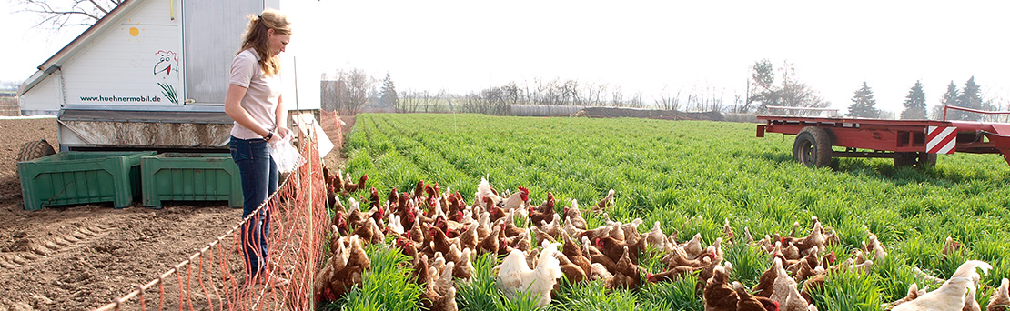 Zu Hause sind die Hühner in einem Hühnermobil, einem mobilen Hühnerstall. Das Hühnermobil ist ein kompletter Stall mit allem, was ein glückliches Huhn braucht: Versorgungs- und Ruhebereiche inkl. Legenester und Schlafplätze mit erhöhten Sitzstangen, viele Fenster und lichtdurchlässige Türen und ein heller und trockner Scharraum (besonders wichtig, falls es einmal zur Stallpflicht kommen sollte) für Körperpflege und sandbaden. Das praktische am Hühnermobil ist, wie sein Name schon verrät, die Mobilität. Der Stall ist in wenigen Minuten versetzt und wird bei uns auf dem Hof alle zwei bis drei Wochen an einen neuen Ort gebracht.